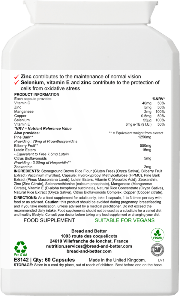 Bilberry, Pine Bark, and Eye Health: Bilberry, rich in anthocyanins, has demonstrated usefulness in addressing vision problems and protecting the retina. Pine bark, with powerful antioxidant capabilities, acts as a free radical scavenger and supports vascular health. Studies have explored its potential benefits in conditions like diabetic retinopathy (for scientific publication see here, here and here).